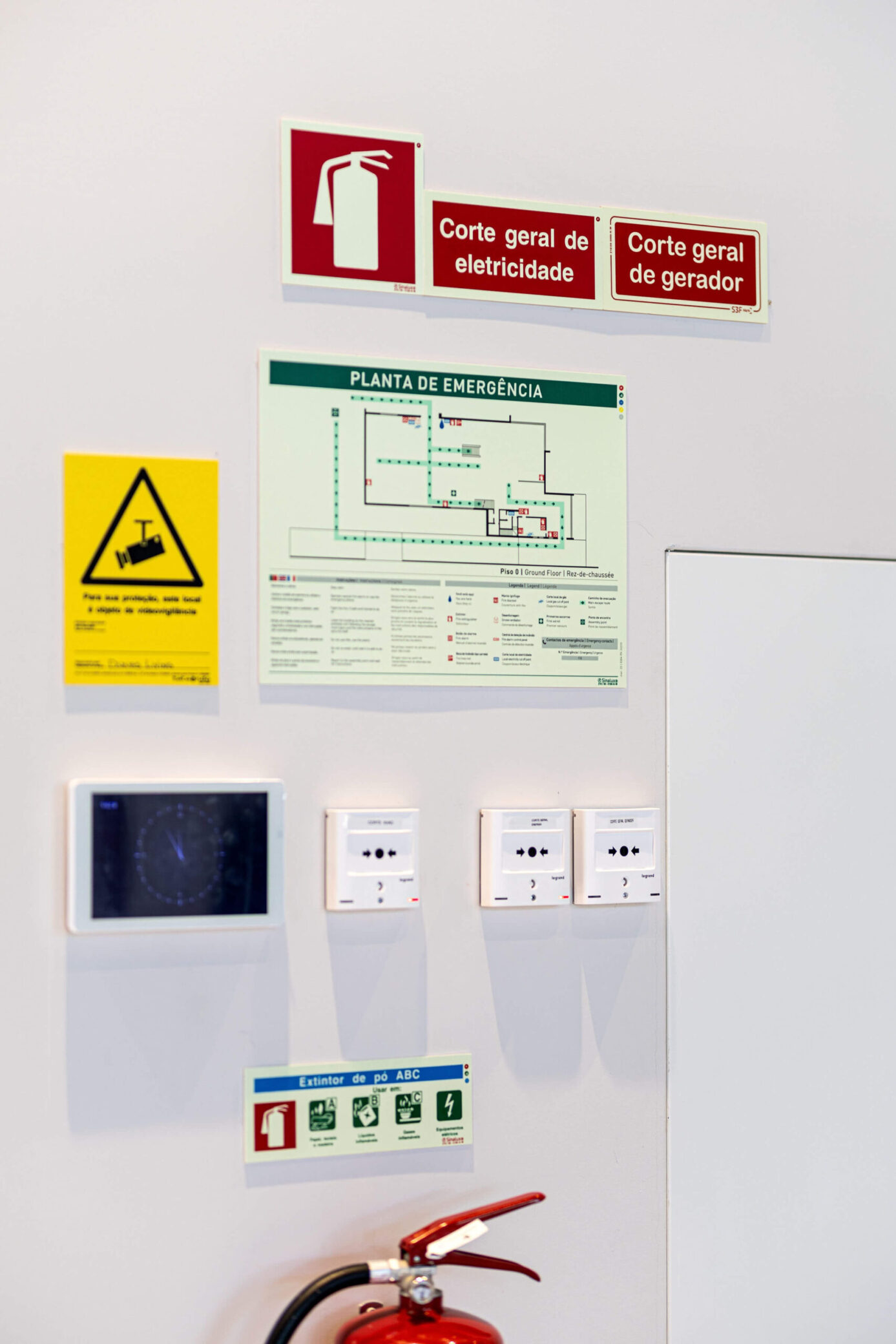 Mapas com saídas, extintores, alarmes, iluminação de emergência e sinalização.